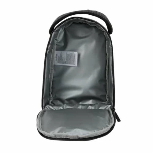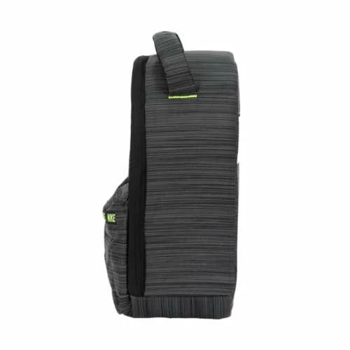 Nike Futura Space Dye Lunch Bag. Main zipper compartment with insulation. Front zipper pocket. Nike logo screened at upper front. Mesh lined top handle. Space dye pattern. Nike branded zipper with pull tab at front pocket. Name tag at back. Dimensions: 8″ x 5″ x 11″. 100% polyester. Imported.
